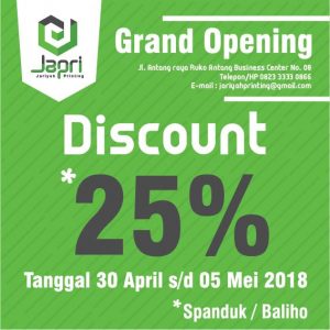 YAJI (30/04/2018). Hari ini, Jariyah Printing (JAPRI) resmi beroperasi untuk memenuhi kebutuhan desain dan cetak warga Makassar. Dengan memberikan diskon hingga 25% untuk setiap cetak spanduk dan baliho sampai Sabtu nanti, membuat customer service JAPRI dibanjiri pertanyaan yang masuk.